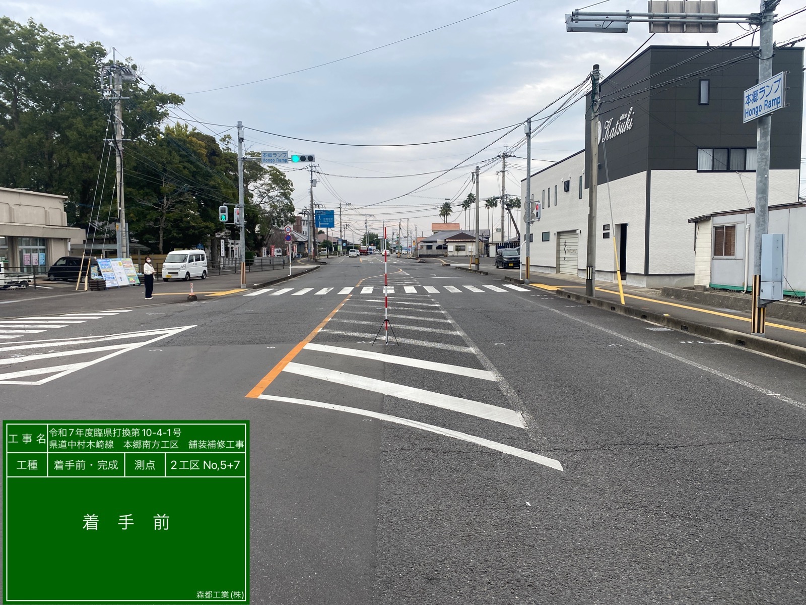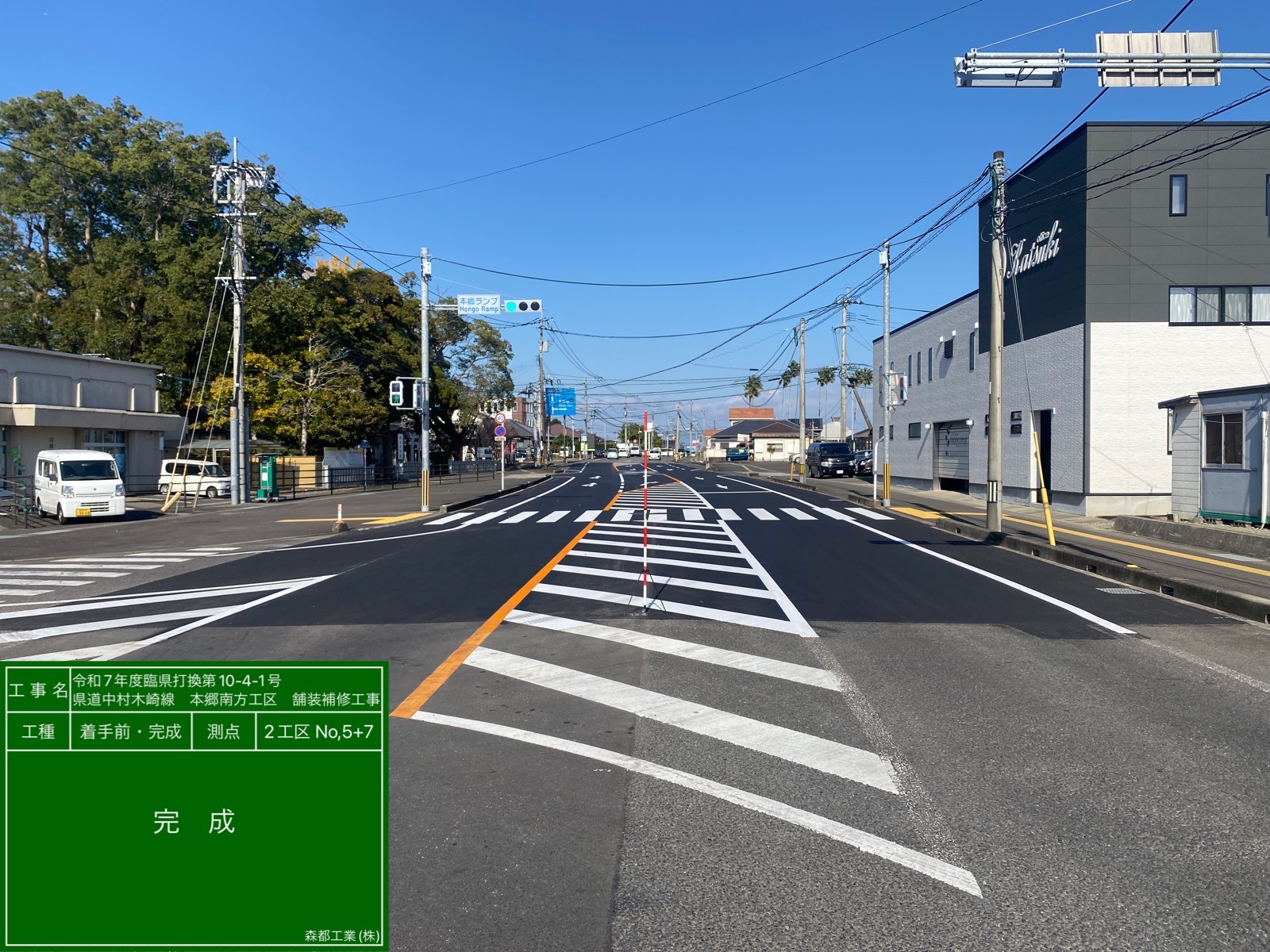 工事実績県道中村木崎線本郷南方工区舗装補修工事・工事名:令和7年度臨県打換第10-4-1号 県道中村木崎線 本郷南方工区 舗装補修工事・竣工日:令和8年1月16日・発注者:宮崎県宮崎土木事務所・工事内容:舗装補修工事着手前完成
