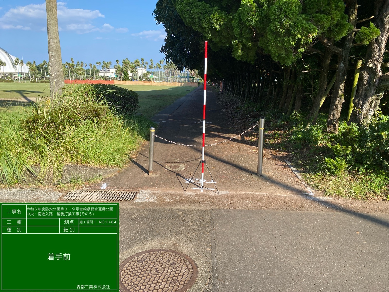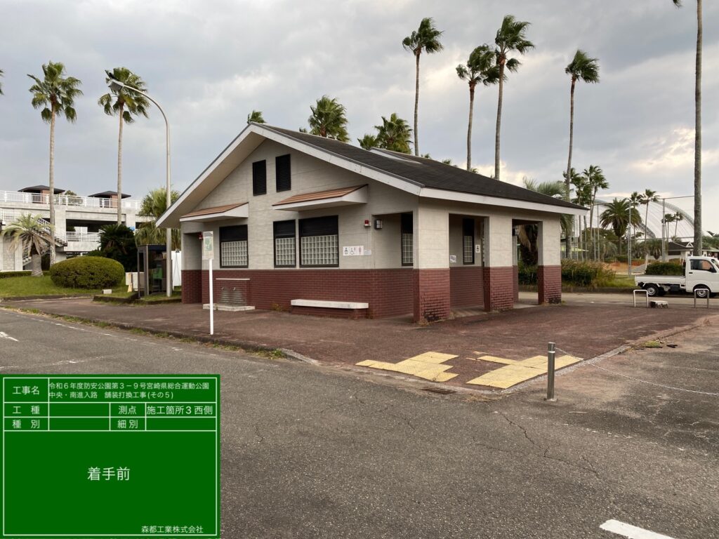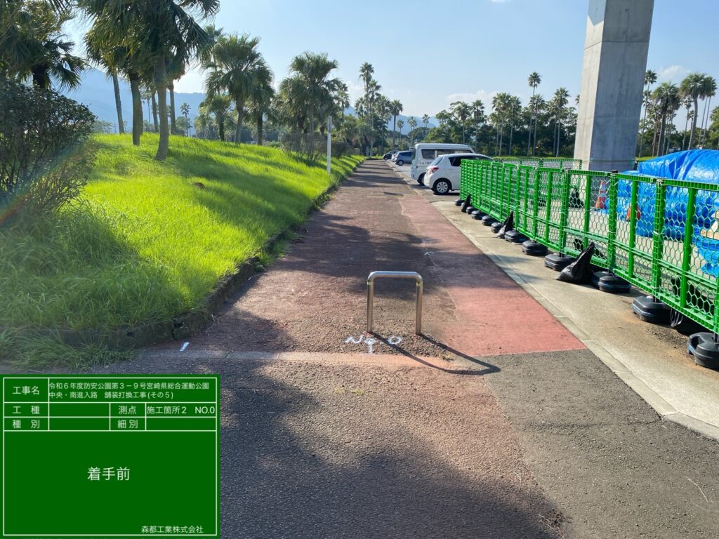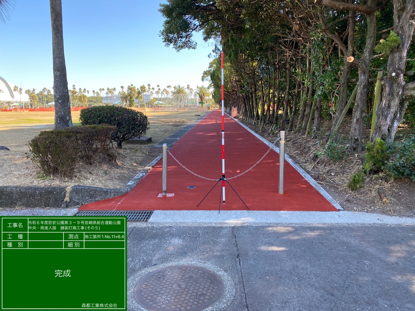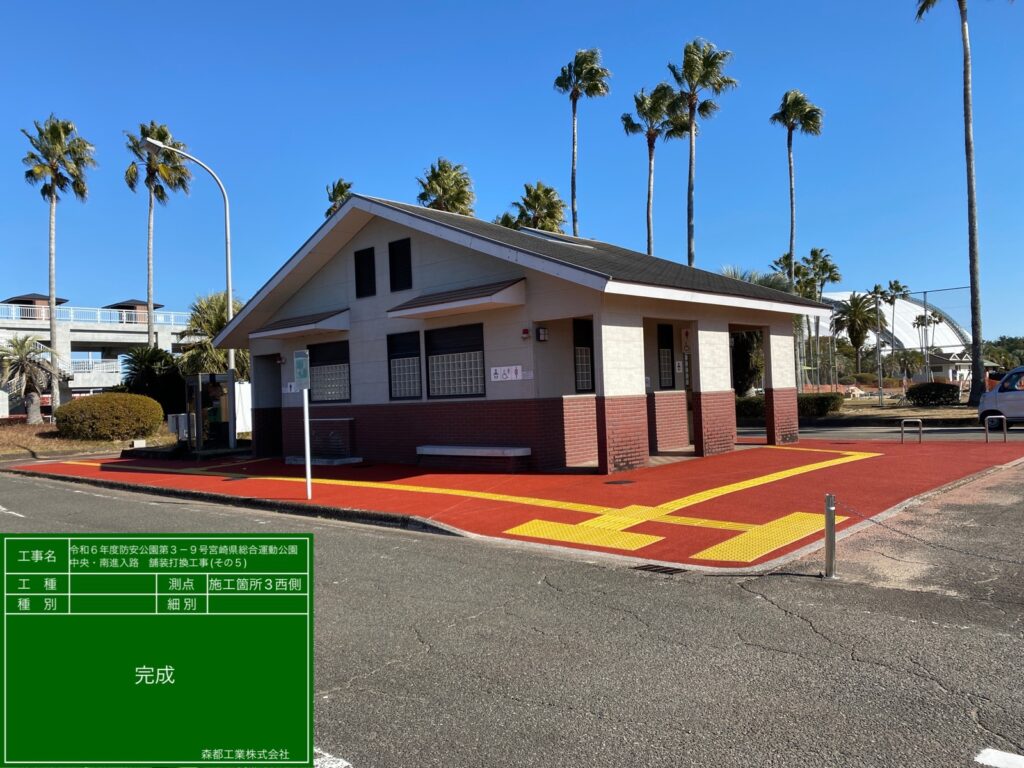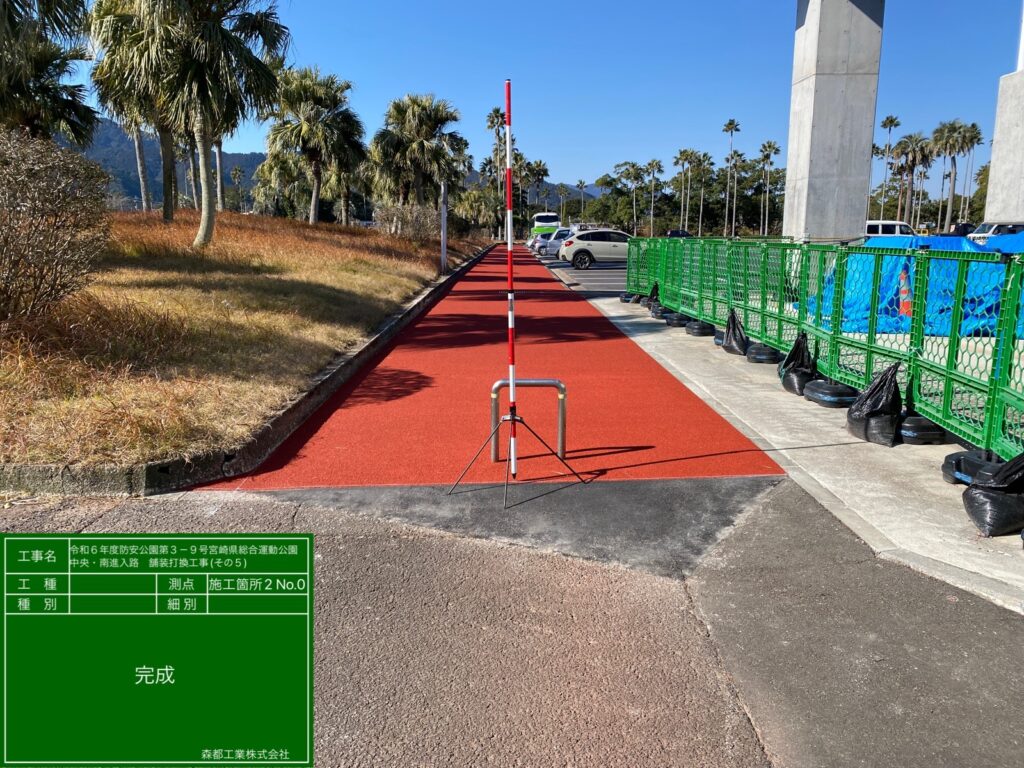 工事実績宮崎県総合運動公園 中央・南進入路 舗装打換工事工事名:令和6年度防安公園第3-9号宮崎県総合運動公園 中央・南進入路 舗装打換工事(その5)竣工日:令和8年2月26日発注者:宮崎県宮崎土木事務所工事内容:薄層カラー舗装工事着手前完成時着手前完成時着手前完成時