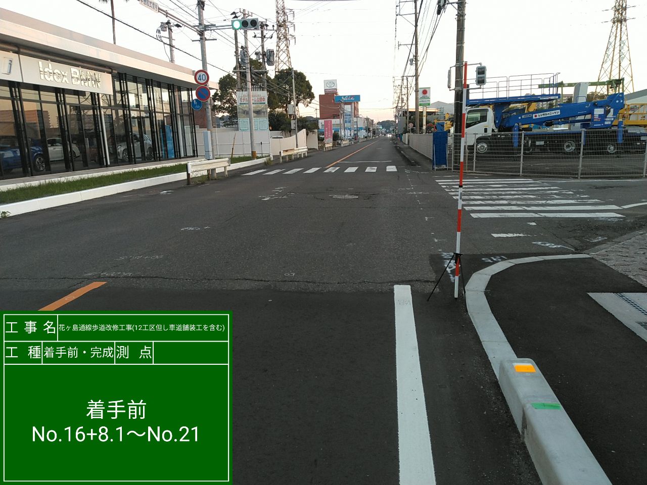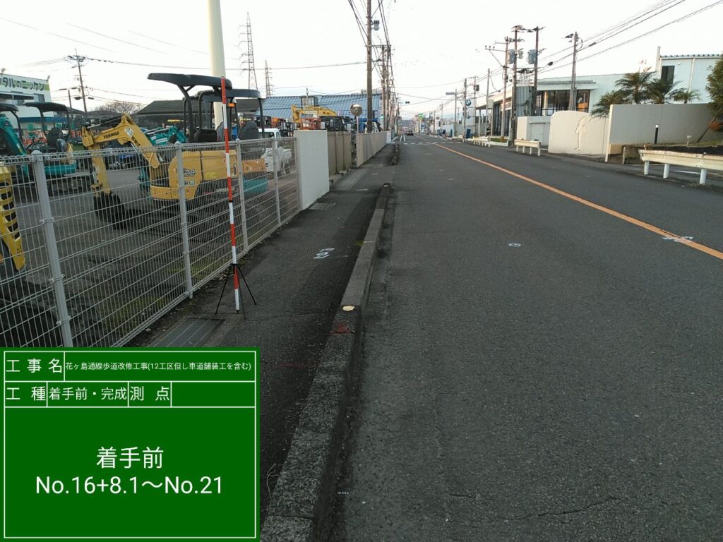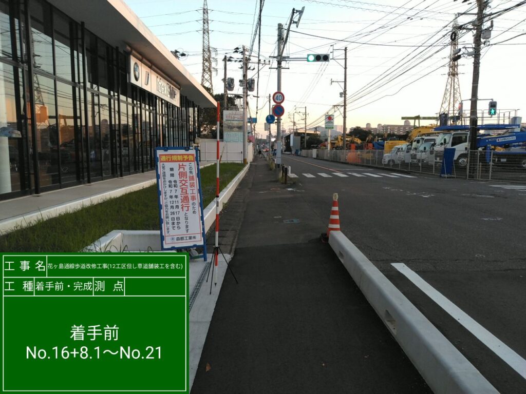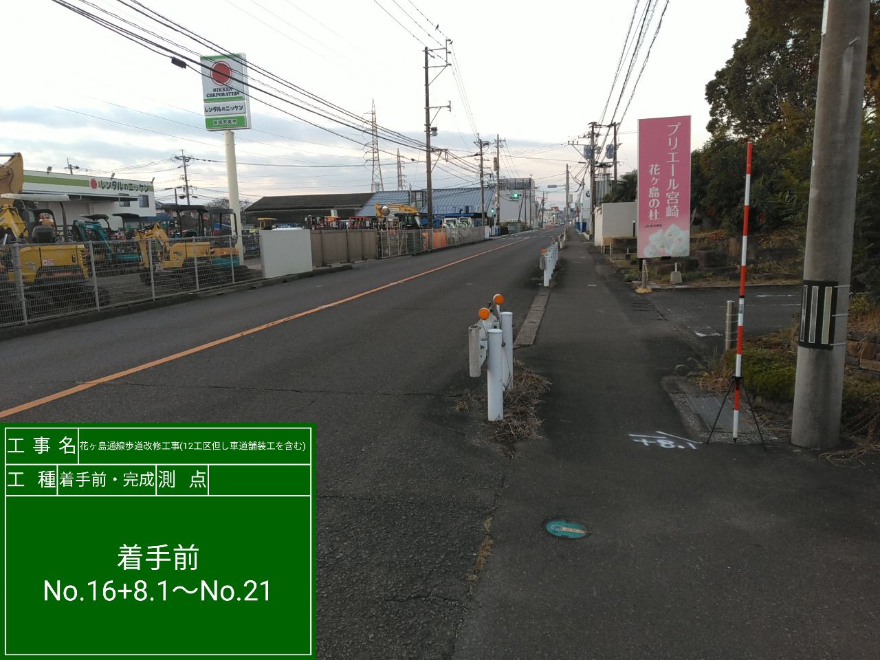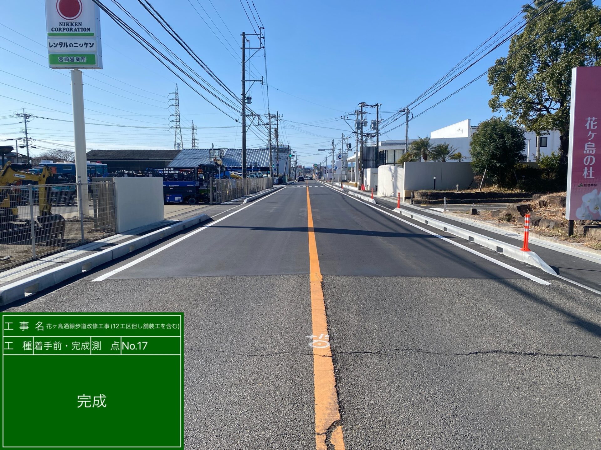 工事実績花ヶ島通線歩道改修工事(12工区但し車道舗装工を含む)・工事名 花ヶ島通線歩道改修工事(12工区但し車道舗装工を含む)・竣工日 令和8年2月13日・発注者 宮崎市役所・工事内容 歩道改修工事着手前 起点 左着手前 起点 右完成 起点着手前 終点 右着手前 終点 左完成 終点